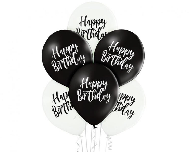 Black White Happy Birthday léggömb, lufi 6 db-os 12 inch (30cm) Anyaga: latex/gumi Mérete: 30 cm (12 inch) A lufi tartó pálca + csésze külön megvásárolható áruházunkban.