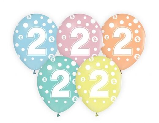 Színes, fehér pöttyökkel és 2-es számmal dekorált luficsomag. A szett 5 db lufit tartalmaz. A lufik felfújt mérete: 30 cm.