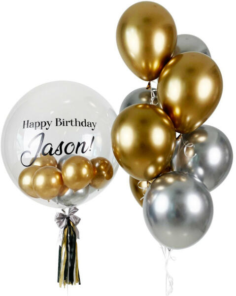 A csokor tartalma: 1db héliumos 24" Deco bubble, mini lufikkal töltve 8db Chrome Latex lufi Léggömb anyaga: latex és bubble Az ár tartalmazza a feliratot, a héliumos töltetet, és 2db nehezéket. A feliratok egyedileg készülnek. Megrendelések teljesítése 2-3 munkanap. Egyéb kéréseidet a rendelés végén lévő megjegyzésben elküldheted részünkre. A termék két dobozba fér,