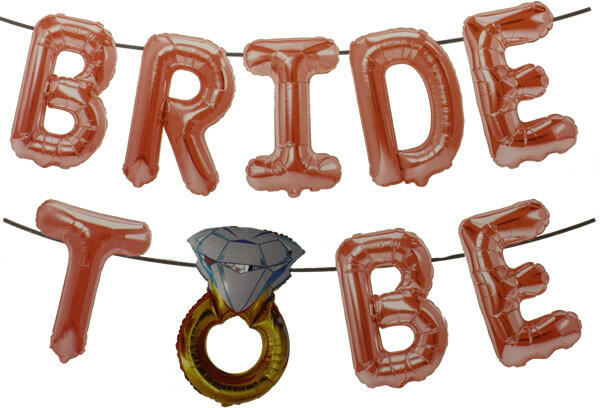 Levegővel fújható "BRIDE TO BE" betűkből álló lufik. Felfűzhető a betükön található fülecskék segítségével. 8 darab rose gold betűből áll a felirat és egy gyémánt gyűrűt megformáló karakterből. A betüket egyesével lehet felfújni, a szelep önzáródó. Betük magassága 35 cm, átlagos szélesség betünként 32 cm. Mérete: 310*35 cm (134*14") Felfűzésre való sz