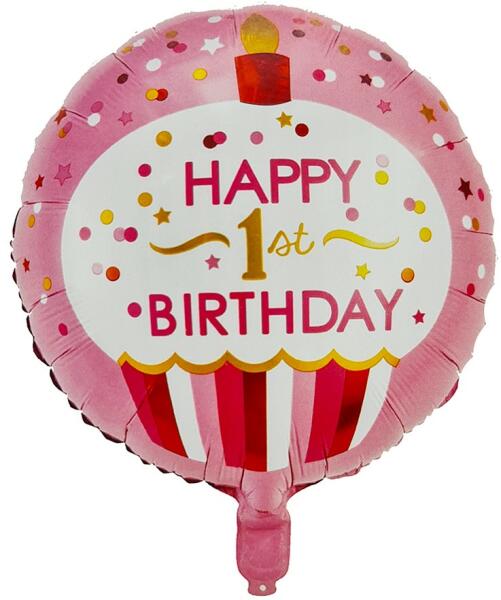 Díszítsd a lakást, vagy jó időben a kertet ennek a kör alakú és rózsaszín színű HAPPY 1st BIRTHDAY feliratú fólia lufinak a segítségével , és biztosan mosolyt csalsz az ünnepelt és a vendégek arcára is. Tulajdonságok: Anyaga: fólia A fólia lufi méretei: 45 cm átmérő A lufi levegővel és héliummal is felfújható. A csomagban található kétoldalas ragasztó a rögz