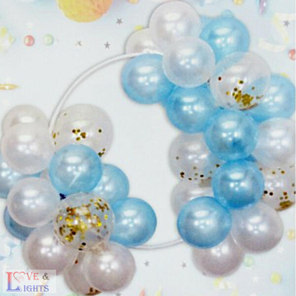 Kék lufi szett Egyedi dekoráció minden alkalomra! 36 db-os lufi szett, egyedi dekoráció babazsúrra, esküvőre, eljegyzésre, születésnapra, de akár az esküvői fotófal szép dekoreleme is lehet. A lufi szett tartalma: 4 db arany konfettis lufi 15 db krém színű lufi 17 db kék lufi 1 db 80 cm átmérőjú karika 1 db szalag