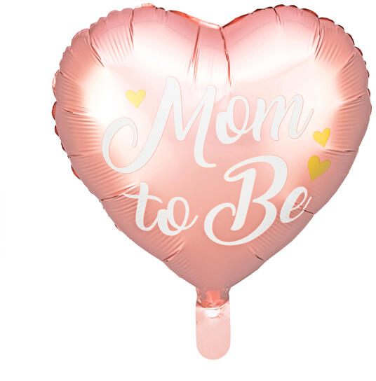 Fólia lufi, szív alakú. "Mom to Be" felírattal, pink színben. Mérete: 35cm. Fújható levegővel vagy héliummal. Egyesével csomagolva.