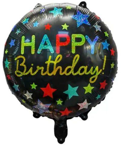 Fólia lufi, 18"/45cm, gömb, vidám mintákkal, Happy birthday. Héliummal vagy levegővel fújható, önzáró szelepes. Egyesével csomagolva.