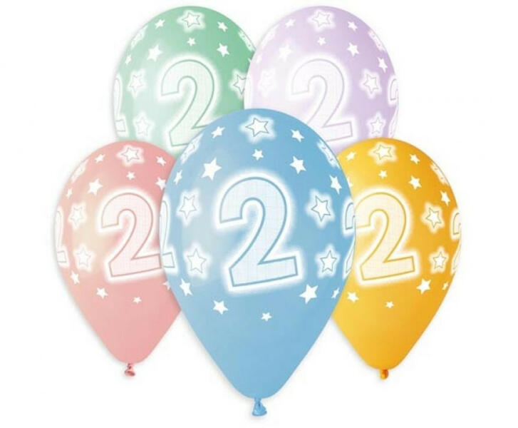 Happy Birthday 2 Star léggömb, lufi 5 db-os Anyaga: latex/gumi Mérete: 33 cm (13 inch) A lufi tartó pálca + csésze külön megvásárolható áruházunkban (DPA9911929).