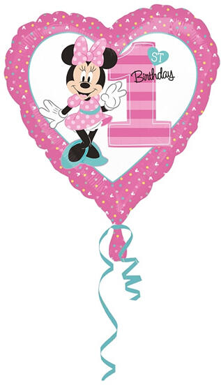 Fólia lufi, 18"/45cm, szív alakú Minni egeres. 1. születésnapra. Héliummal vagy levegővel fújható, önzáró szelepes. Egyedi eurófüles csomagolásban.