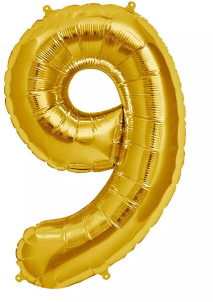 9-es számot formázó óriás, nagy méretű, héliummal tölthető fólia lufi arany színben. 9-es számot formázó óriás, nagy méretű, héliummal tölthető fólia lufi arany színben. Kilencedik születésnapra ajánljuk, de más számokkal kiegészítve lehet belőle készíteni 19-es, 90-es, 89-es, stb számokat is. Anyaga: fólia Mérete: 105cm