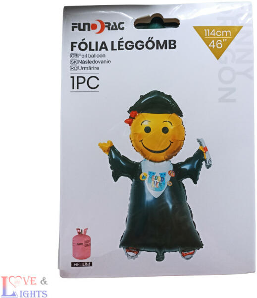 Smiley mintás ballagási fólia lufi Felfújható : levegővel vagy héliummal Mérete: 114 cm magas A csomag tartalma: 1 db lufi + 1 db szívószál a felfújáshoz, két darab kétoldali ragasztó pont