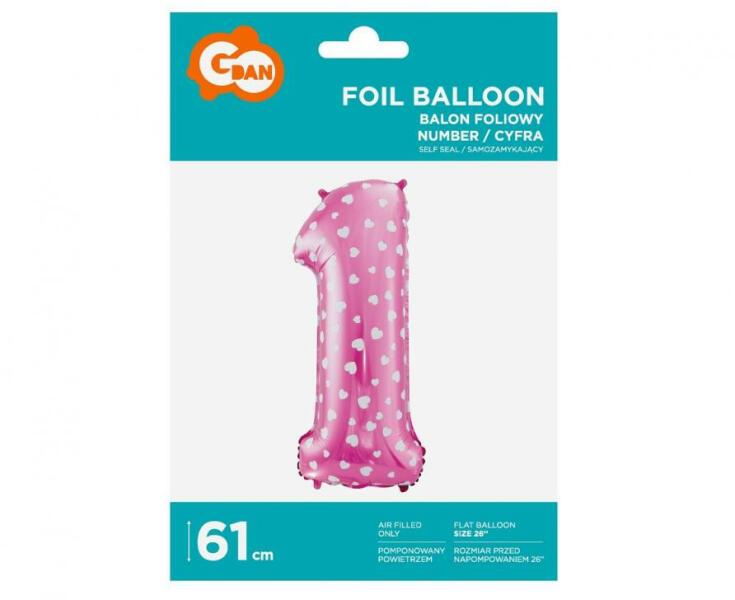 Pink with Hearts, Rózsaszín 1-es szám fólia lufi 61 cmFólia léggömb, mely héliummal vagy levegővel tölthető. A lufi önzárószeleppel van ellátva, amely megakadályozza a gáz elszökését. Méret: 61 cm Anyaga: fólia A lufi tartó pálca + csésze külön megvásárolható áruházunkban. Pink with Hearts, Rózsaszín 1-es szám fólia lufi 61 cmFólia léggömb, mely héliummal va
