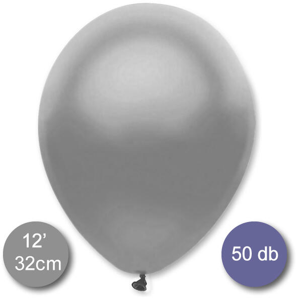 Ezüst lufi, metál színben, levegővel vagy gázzal való feltöltésre alkalmas átmérő: 32 cm. 50 db/csomag.