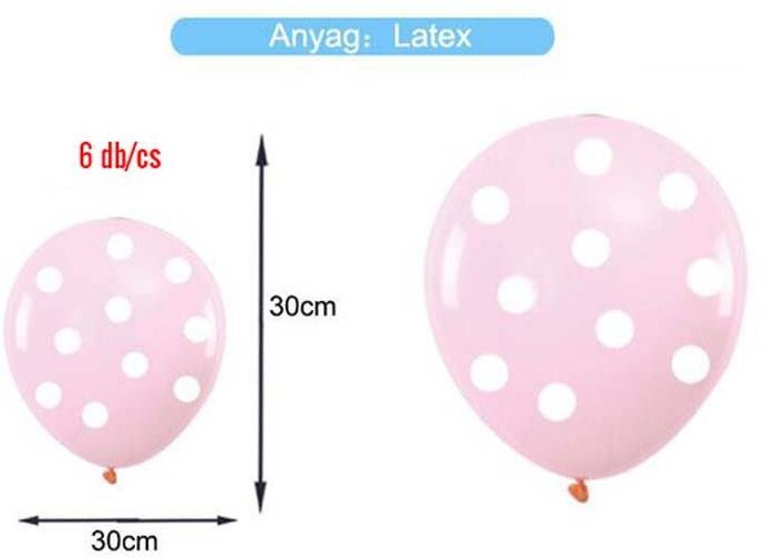 Lufi csomag színes, fehér pöttyös, 30cm, 6db Termékjellemzők: Anyaga: műanyag Alkalom: Bármilyen Figyelmeztetés: Figyelmeztetés: 8 év alatti gyerekek esetén fulladásveszélyes a felfújatlan lufi. ; 3 éves kor alatt nem ajánlott!; Figyelmeztetés: fulladásveszély, kis alkatrészek! Kinek ajánlott: Bárkinek