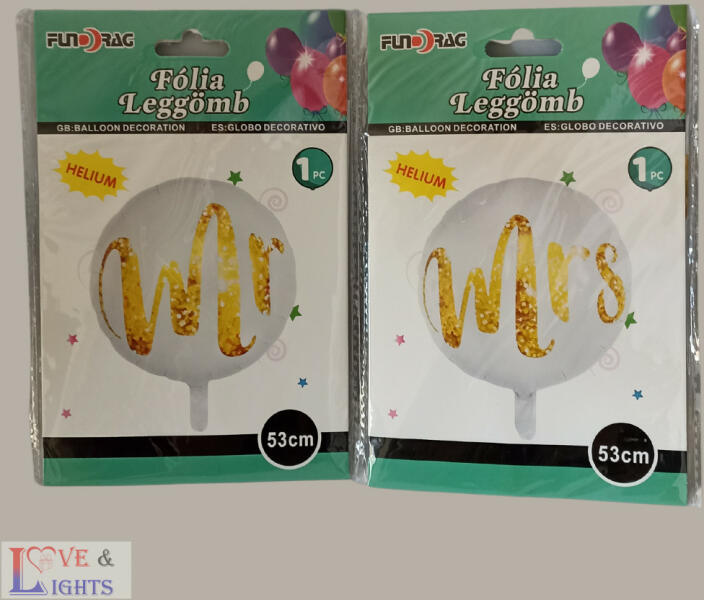 Héliummal és levegővel is feltölthető fólia lufik párban Mr és Mrs A lufik mérete 53 cm átmérő Fólia lufik, mely levegővel és héliummal is feltölthetőek! Mr és Mrs feliratos fehér és arany színekben. A fólia lufik külön is megvásárolhatóak. A lufik mérete: 53 cm átmérő