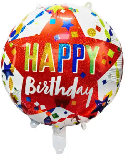 Fólia lufi, 18"/45cm, gömb, vidám mintákkal, Happy birthday. Héliummal vagy levegővel fújható, önzáró szelepes. Egyesével csomagolva.