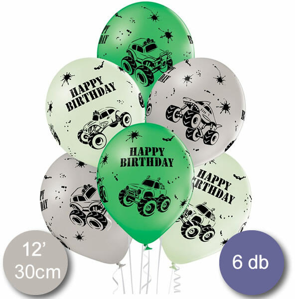 Monster lufi, Happy Birthday felírattal. Átmérő: 30 cm. Tölthető gázzal, levegővel. Teljes felületén mintázott. Egy csomagban 6 db van.