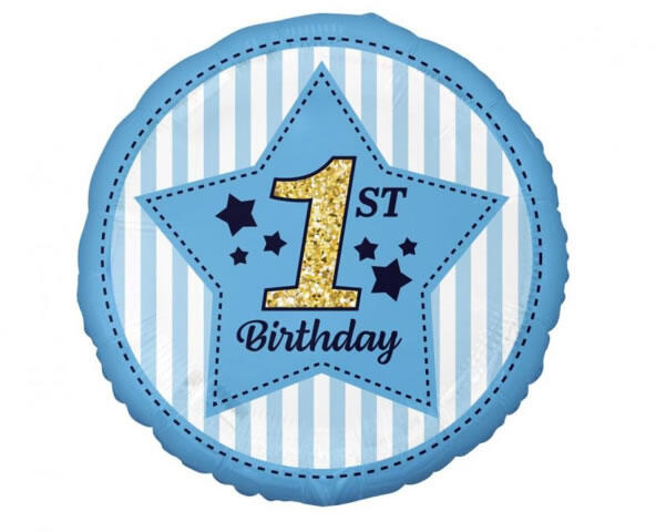 Fólia lufi, 18"/45cm, gömb alakú, kék mintákkal. 1. születésnapra. Héliummal vagy levegővel fújható, önzáró szelepes. Egyedi eurófüles csomagolásban.