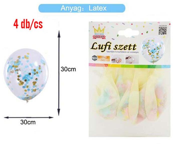 Lufi csomag- kék konfettivel, 4db 30cm Termékjellemzők: Anyaga: műanyag Alkalom: Bármilyen Figyelmeztetés: Figyelmeztetés: 8 év alatti gyerekek esetén fulladásveszélyes a felfújatlan lufi. ; 3 éves kor alatt nem ajánlott!; Figyelmeztetés: fulladásveszély, kis alkatrészek! Kinek ajánlott: Bárkinek