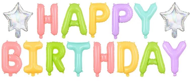Fólia lufi - Happy birthday színes A lufik egyedi és esztétikus kiegészítői minde n partinak vagy társasági eseménynek . Készítsen lufi díszítést a születésnap napján és varázsoljon felejthetetlen hangulatot. NEM alkalmas héliummal való felfújásra méret : 395 x 35 cm szín : mix színek (sárga, világos rózsaszín, világos zöld, menta színű, lila) 2 db szívárvány