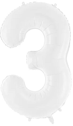 Fólia lufi, 86 cm, 3-as szám alakú, fehér. Héliummal vagy levegővel fújható, önzáró szelepes. Egyedi eurófüles csomagolásban.