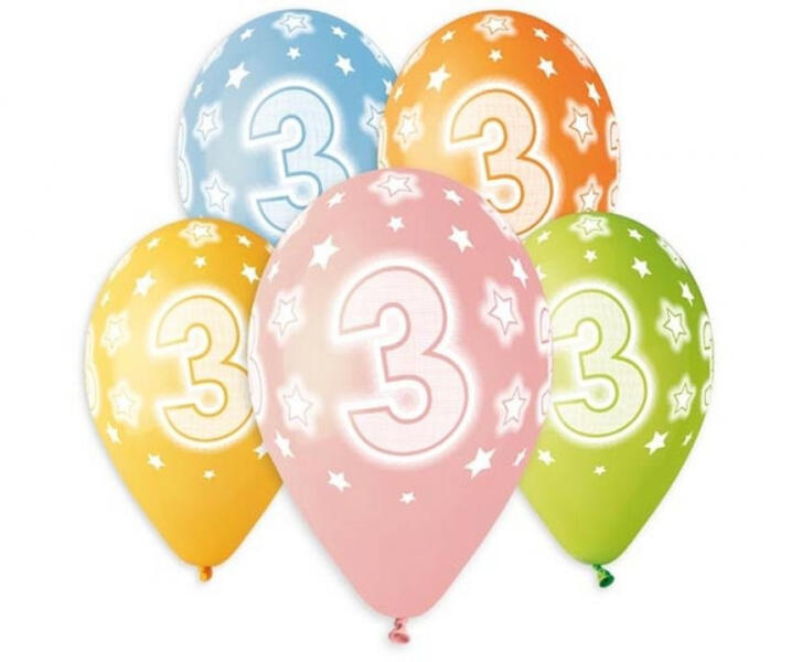 Happy Birthday 3 Star léggömb, lufi 5 db-os Anyaga: latex/gumi Mérete: 33 cm (13 inch) A lufi tartó pálca + csésze külön megvásárolható áruházunkban (DPA9911929).