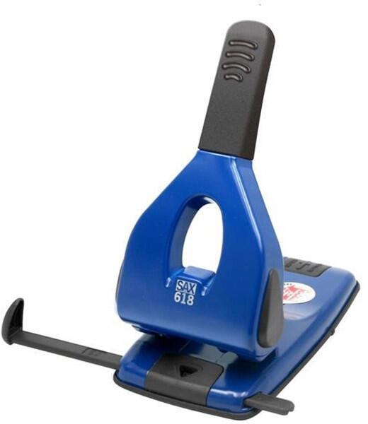 Sax 618 kék lyukasztógép - Nagyteljesítményű, könnyűfém testű, karos lyukasztógép, műanyag ütköztetőléc, gumírozott nyomófelület - A lyukasztóbélyeg mechanikájának köszönhetően 50%-kal kevesebb erőkifejtés szükséges a lapok átlyukasztásához - Egyszerre lyukasztható lapok száma: max. 65 lap - Lyuktávolság: 80 mm - Lyukátmérő: 5,5 mm