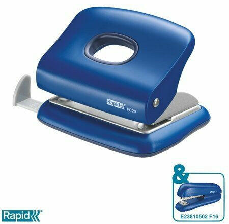 Lyukasztó, kétlyukú, 20 lap, RAPID FC20, vízkék (E23256401) - erős, fém lyukasztó megerősített, ABS műanyagból készült karral és talppal - otthoni, iskolai és irodai használatra - az erős, fém konstrukció tökéletes lyukasztást eredményez - könnyen üríthető, műanyag tartály - távtartóval - kapacitás: 20 lap (80 g-os) - lyukátmérő: 5,5 mm - lyuktávolság: 8 cm fi