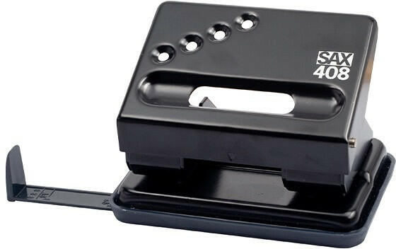 Lyukasztó SAX 408 2 lyukú fém 30 lap fekete Irodai, asztali, színes fémvázas lyukasztó, távtartóval, papírhulladék tartóval ellátva. Lyukasztási kapacitással: 30 lap. Lyuktávolság: 80 mm. Lyukátmérő: 5,5 mm.