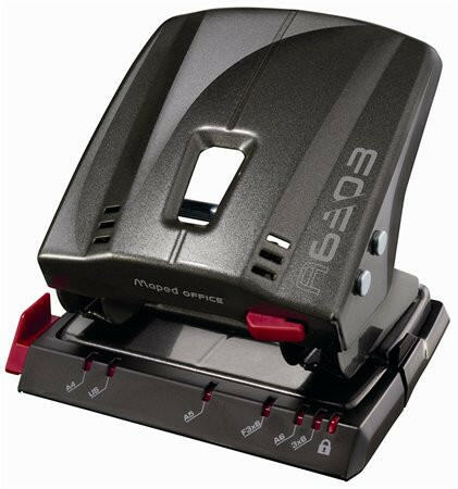 Lyukasztó, kétlyukú, 35 lap, fém, MAPED "Advanced", sötétbarna fémtest, matt bevonat kidolgozottság és letisztult dizájn kombinációja távtartó bemélyedés a konfettitartó tálcán a gyűrűskönyvek és emelőkaros iratrendezők fémszerkezetének odaillesztéséhez, a dokumentumok pontos helyen történő lyukasztásához lyukátmérő: 5,5 mm 10 év garancia
