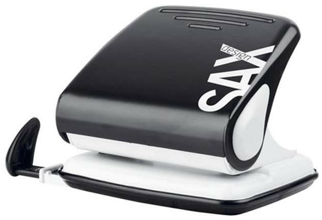 Lyukasztó, kétlyukú, 25 lap, SAX "Design 418", fekete - könnyűfém test, fém szerkezet - távtartó - lyuktávolság: 80 mm - lyukátmérő: 5,5 mm - lyukasztási kapacitás: 25 lap - életre szóló garancia