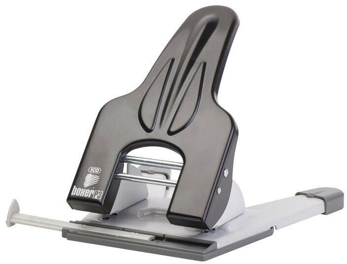 Formatervezett lyukasztógép, szabadsínes műanyag távtartó. Egyszerre lyukasztható lapok száma: max. 30 lap. Lyuktávolság: 80 mm. Lyukátmérő: 5,5 mm. Katalóguskód: 13614