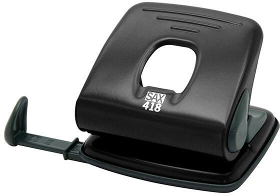 Lyukasztó SAX 418 2 lyukú fém 25 lap fekete Könnyűfém test, fém szerkezet, ütköztetőléc. Egyszerre lyukasztható lapok száma: max. 30 lap. Lyuktávolság: 80 mm. Lyukátmérő: 5,5 mm.