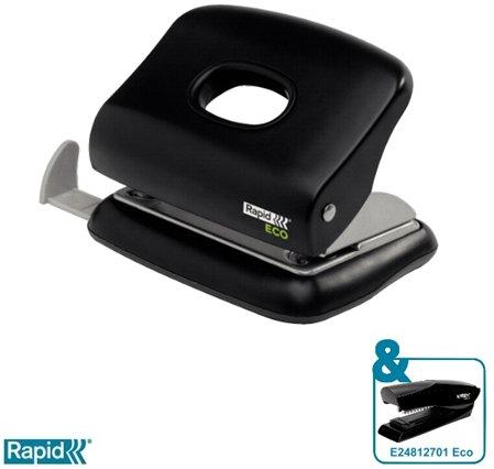 Lyukasztó, kétlyukú, újrahasznosított, 20 lap, RAPID "Eco 20", fekete - E24845300 - Asztali lyukasztók 20 lapig - - kompakt, de erős lyukasztó 100%-ban újrahasznosított kommunális műanyag hulladékból, újrahasznosított karton csomagolásban - könnyen üríthe