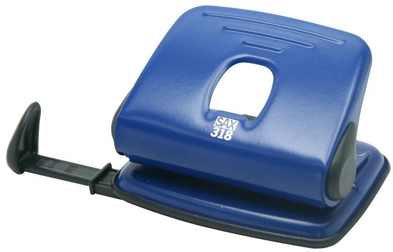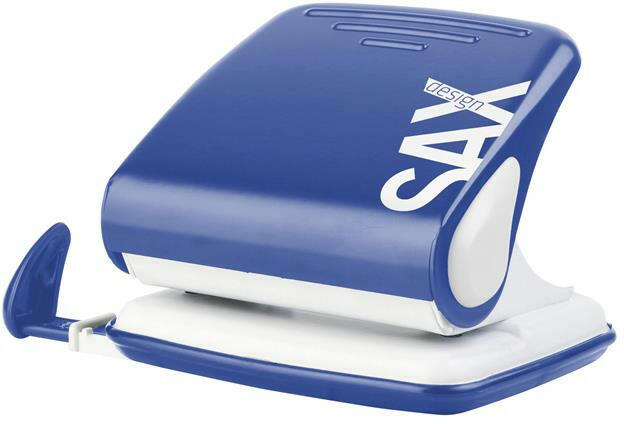 Lyukasztó, kétlyukú, 25 lap, SAX "Design 418", kék - könnyűfém test, fém szerkezet - távtartó - lyuktávolság: 80 mm - lyukátmérő: 5,5 mm - lyukasztási kapacitás: 25 lap - életre szóló garancia