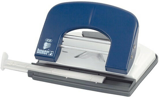Lyukasztó BOXER P1 2 lyukú fém 15 lap kék Irodai, asztali, színes fémvázas lyukasztó, távtartóval, papírhulladék tartóval ellátva, 15 lap lyukasztási kapacitással.