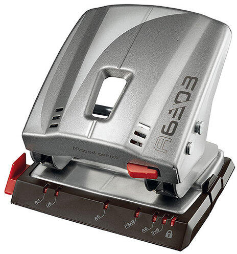 Asztali lyukasztó alkalmas mindennapi használatra. A szabadalmaztatott fogantyúnak és az éles lyukasztó szegmenseknek köszönhetően kisebb erő kell a lyukasztáshoz. A pontos lyukasztást a fix rögzítésű és az egyes formátumok kontrasztos jelölésével rendelkező vezetőszár biztosítja. Könnyű ürítés.