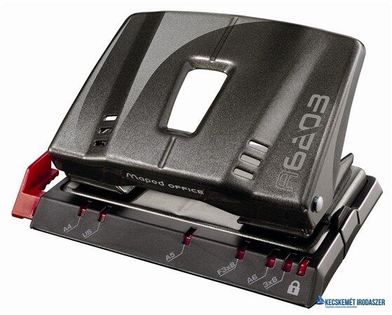 Irodai lyukasztó csúszó vonalzóval, anyaga fém műanyaggal kombinálva, lyuktávolság 8 cm, lyukasztási kapacitás 25 lap. Lyuk átmérője 5,5 cm.