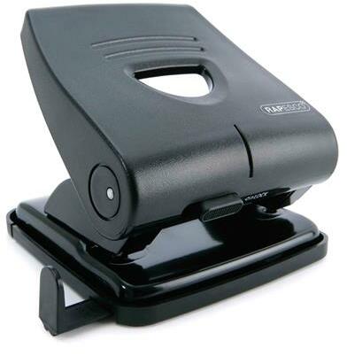Lyukasztó, kétlyukú, 25 lap, fém, RAPID "FMC25", fekete - erős, fém lyukasztó blokkolható lyukasztó karral a helytakarékos tárolás érdekében - irodai használatra ajánlott - az erős, fém konstrukció tökéletes lyukasztást eredményez - nagyméretű, könnyen üríthető tartály - blokkolható szerkezettel és távtartóval - kapacitás: 25 lap (80 g-os) - lyukátmérő: 5,5 mm