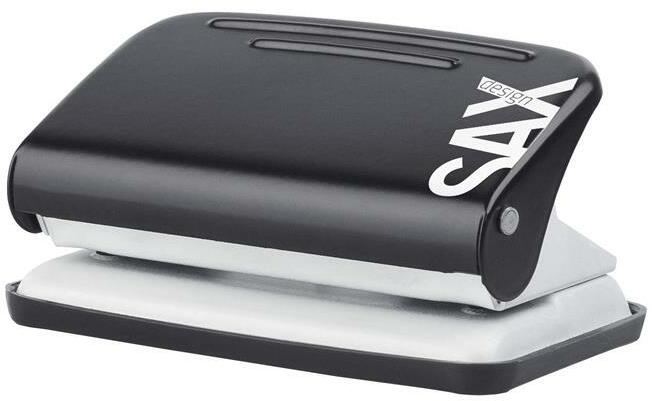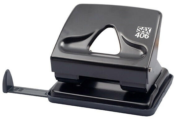 Lyukasztó SAX 406 2 lyukú fém 30 lap fekete Könnyűfém testű, fémszerkezetű lyukasztógép, ütköztető léccel. Egyszerre lyukasztható lapok száma: max. 30 lap. Lyuktávolság: 80 mm. Lyukátmérő: 5,5 mm.