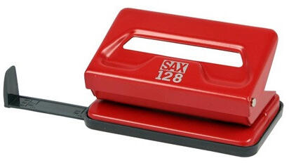 Sax 128 s piros lyukasztó - Könnyűfém testű, fémszerkezetű lyukasztógép, ütköztetőléccel - Egyszerre lyukasztható lapok száma: max. 12 lap - Lyuktávolság: 80 mm - Lyukátmérő: 5,5 mm