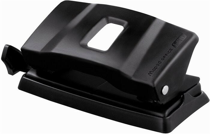 Lyukasztó, kétlyukú, 12 lap, fém, MAPED "Essentials 12", fekete fém test, fekete matt bevonat letisztult dizájn és célszerűség kombinációja távtartó bemélyedés a konfettitartó tálcán a gyűrűskönyvek és emelőkaros iratrendezők fémszerkezetének odaillesztéséhez, a dokumentumok pontos helyen történő lyukasztásához lyukátmérő: 5,5 mm 5 év garancia