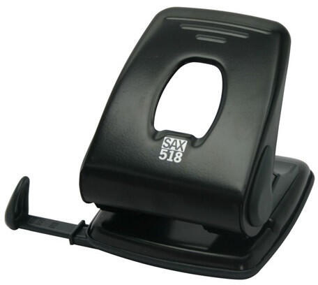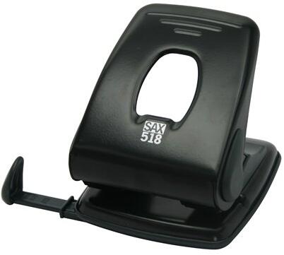 Sax 518 fekete lyukasztó - Könnyűfém test, fém szerkezet, ütköztetőléc - Egyszerre lyukasztható lapok száma: max. 40 lap - Lyuktávolság: 80 mm - Lyukátmérő: 5,5 mm