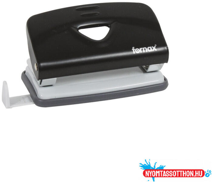 Lyukasztó 10lap Fornax fekete Könnyűfém testű, fémszerkezetű lyukasztógép, ütköztetőléccel. Állítható a távtartósín, hulladéktárolóval. Lyuktávolság: 80mm. Egyszerre lyukasztható lapok száma: 10 lap