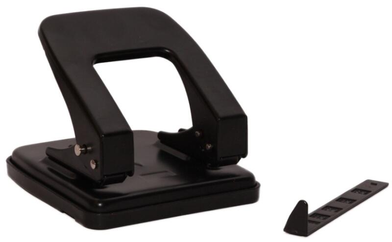 Irodai, asztali, színes fémvázas lyukasztó, távtartóval, papírhulladék tartóval ellátva, 40 lap lyukasztási kapacitással.