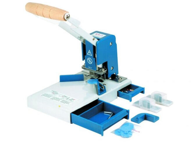Gyémánt sarokkerekítő Ez a sokoldalú saroklekerekítő egy 6,4 mm-es sugarú vágószerszám segítségével lekerekíti a papír sarkait. Ugyanakkor lyukasztóként is szolgál, egyszerre akár 100 ív 80 grammos papír vágási kapacitásával is. A kar ergonomikus fogantyúja biztosítja a készülék kényelmes kezelését. A törmeléktálca viszont megakadályozza, hogy a munkalapon sze