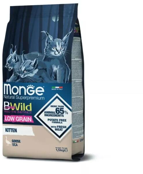 Monge BWild Low Grain Cat Kitten - Goose Teljes értékű és kiegyensúlyozott, csökkentett gabonatartalmú szárazeledel kölyök macskáknak libával. Az olyan válogatott, nem gabonából származó szénhidrátforrásoknak köszönhetően, mint a burgonya és a lencse, támogatja macskája egészségét. Mangán-oligoszacharidokkal (M. O. S. ) és Xylo-oligoszacharidokkal (XOS), valamint pro