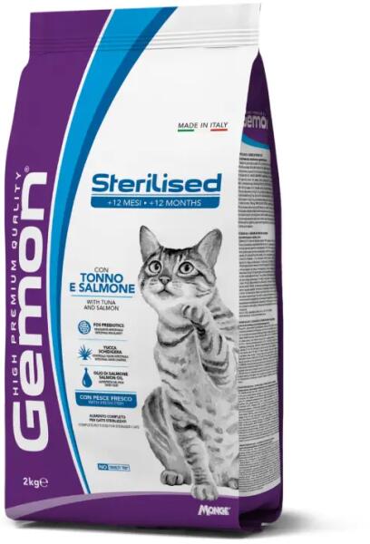A Gemon Cat Steril Adult tonhal-lazac teljes értékű állateledel sterilizált felnőtt macskák számára. Az eledelt olyan minőségi összetevők jellemzik, mint a tonhal és a lazac, amely alapvető tápanyagok forrása, és a rizs, ami kiváló szénhidrát forrás. Az extrudálási eljárásnak köszönhetően pedig rendkívül emészthető a táplálék. A prebiotikumok, fruktooligoszacha