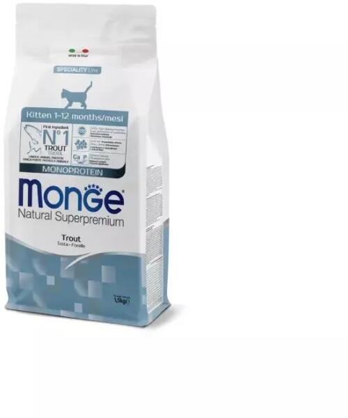 Monge Cat Speciality Line Monoprotein Kitten - TroutTeljes értékű, kiegyensúlyozott szárazeledel kölyök macskák számára. Kizárólag egyféle, friss halból származó állati fehérjét tartalmaz, ami ízletessé és könnyen emészthetővé teszi. A megfelelő kálcium-foszfor aránynak köszönhetően elősegíti a kiegyensúlyozott növekedést. A termék xylo-oligoszacharideket és