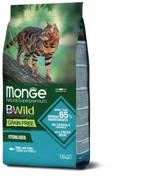 Monge BWild Grain Free Cat Adult Sterilised - Tuna, Peas Teljes értékű és kiegyensúlyozott, gabonamentes szárazeledel ivartalanított, felnőtt macskáknak tonhallal és borsóval. Az olyan válogatott, nem gabonából származó szénhidrátforrásoknak köszönhetően, mint a burgonya és a lencse, támogatja macskája egészségét. Mangán-oligoszacharidokkal (M. O. S. ) és Xylo-oligosz