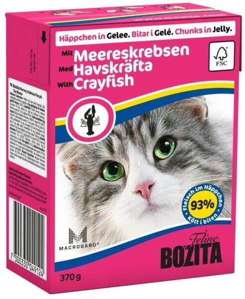 BOZITA Macskarák zselé 370g - Leírás Ízletes friss húsdarabok zselében, kifejezetten macskák számára rák ízesítéssel. A gyártás során felhasznált friss hús szigorú minőségellenőrzésnek van alávetve. Az élelmiszerben található természetes A-, B- és D-vitaminok, valamint a taurin garantálják a szervezet megfelelő és egészséges működését. Összetétel Csirke R