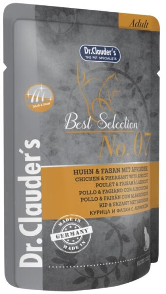 Teljes értékű nedves eledel felnőtt macskák részére csirkével, fácánnal és sárgabarackkal, magas hústartalommal. a sáfrányolaj támogatja a macska bőrét és szőrét a sárgabarack rendkívüli mennyiségű A-provitamint (karotint), valamint B1-, B2- és C-vitamin t, valamint ásványi anyagokat, például káliumot, kalciumot és foszfor t tartalmaz. Még a legválogatósább cic