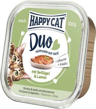 600g A Happy Cat Duo szárnyas- és bárányhúsos pástétom falatkák egy teljes értékű eledel felnőtt macskák számára. Alul pástétom, felül szószos falatok ( ---> Duo ), vitaminokban gazdag, biotin tartalommal, ami erősíti a bőrt, szőrt és a karmokat. Válogatós macskáknak is kiváló választás.